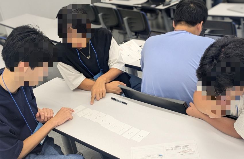 続いて、整列アルゴリズムについて学習しました。グループに分かれて、10枚のカードを使いながらバブルソートや選択ソートのアルゴリズムについて理解を深めました。実際に手を動かして並び替えを体験し議論をすることで、各アルゴリズムの特徴や処理の流れを視覚的に捉えることができました。