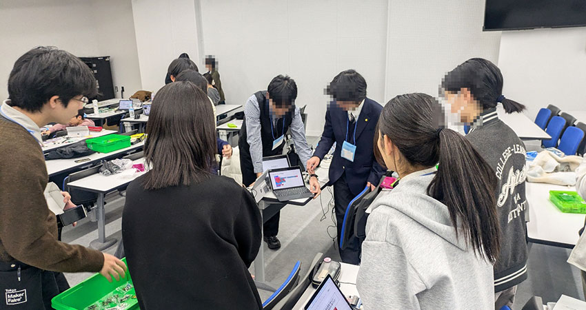 グループに分かれ、身近な課題の解決に向けた装置の実装から考察まで取り組みました。各グループには本学学生スタッフ(TA)が加わり、助言を行いながら意見を整理し、スライドにまとめて発表できるよう支援しました。事前にブレインストーミングを行い、アイデアを共有したことで、目標が明確になり、作業分担もスムーズに進みました。活動の中では試行錯誤を重ねる様子が見られ、過程で新たな課題に気づき探究心が高まっている様子がうかがえました